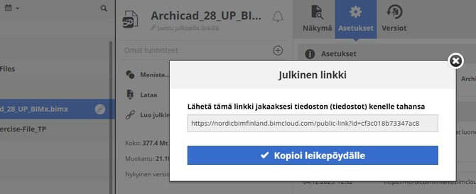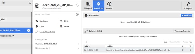 Jos päivität tiedoston, tai lisäät/poistat tiedostoja kansiossa, linkistä avautuu aina ajantasainen tilanne (linkki ei siis sitoudu luontihetken tiedostoversioon). Linkki säilyy myös, vaikka nimeäisit kohteen uudestaan, tai siirrät sitä BIMcloudin kansioissa.
