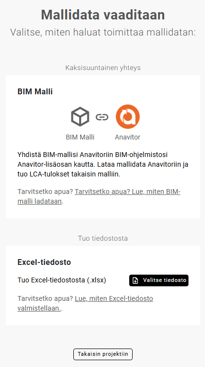 - Avaa Anavitorissa projekti ja luo uusi Alaprojekti. Mallidatan osoittamisen sivu aukeaa: