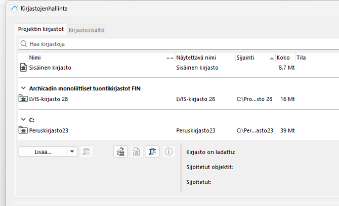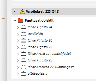 Yllä olevassa esimerkissä mm. 'Archicad 27 Tuontikirjasto' puuttuu. Käytännössä yleensä vanhempien versioiden puuttuvat objekteille löytyy tästä samasta kirjastosta tuore yhteensopiva versio, joten keskitytään ensin aina uusimpaan puuttuvaan kirjastoon.