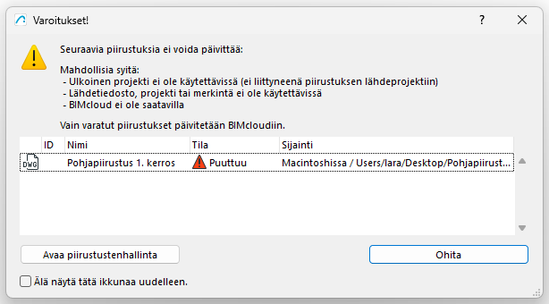 Jos viitteiden automaattinen tarkistus on käytössä, sinun tulee myös tarkistaa viitteiden hallinnassa, että kaikki viitteet ovat kunnossa ja projektin käyttäjien saatavilla. Puuttuvina listattujen linkitettyjen tiedostojen etsiminen vie Archicadilta aikaa. Jos käytössä on viitteiden manuaalinen tarkistus, viivettä syntyy vasta kun pyydät aktiivisesti Archicadin päivittämään viitteet.
