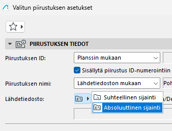 Jos olet varma, että tiedostot ovat aina samassa kansiossa ja samalla palvelimella koko projektin ajan, voit valita absoluuttisen sijainnin. Archicad ei tällöin käytä tarpeetonta aikaa tiedostojen etsimiseen käynnistyksen yhteydessä. Polun on tällöin oltava sijainnissa, joka on aina projektin käyttäjien käytettävissä, ja sama kaikille käyttäjille.