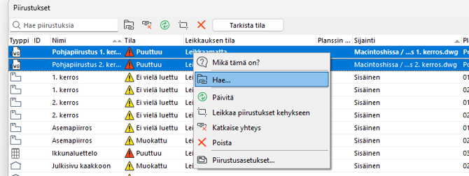 - Jos kaikki puuttuvat tiedostot ovat samassa kansiossa, helpoin tapa korjata rikkinäiset linkit on valita ne kaikki Piirustusten hallinnassa ja napsauttaa niitä hiiren kakkospainikkeella. Valitse sitten Hae... ja etsi kansio, jossa linkki sijaitsee.