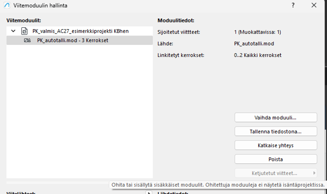 Käytä siis mahdollisuuksien mukaan myös Ohita ketjutetut viitteet -toimintoa, jotta elementtejä ei linkitetä takaisin moduulin sisältä, jos ne ovat jo pääprojekissa.