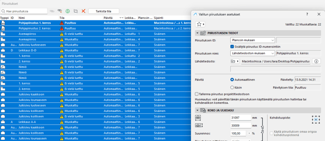 Jos pohjapiirroksessa/leikkauksessa näkyy mustia pisteitä, tiedostosta puuttuu elementtejä. Avaa Kirjastojenhallinta ja tarkista, mitkä kirjastot on lueteltu puuttuviksi. Lisää ne ja palaa malliin nähdäksesi, ovatko mustat pisteet nyt poissa ja muuttuneet elementeiksi.