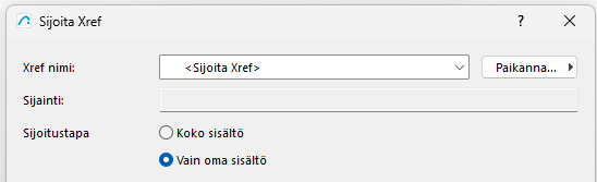 Vain karttoja on joskus tarpeen tuoda Xref-menetelmällä ja silloinkin Vain oma sisältö (Underlay) -valinnalla sijoitusasetuksissa.
