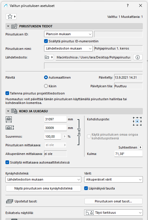 Kuvatasoja voidaan hallita Piirustuksen omat tasot -toiminnolla. Niitä ei silloin lisätä Archicad-projektin tasoihin, joten vältyt saamasta projektiin suurta määrää tasoja DWG:n sisältä.