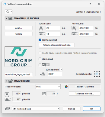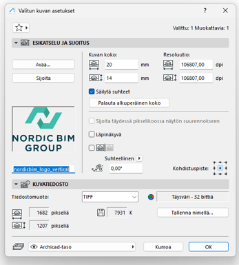 Kuvatiedostoja käytetään usein nimiöissä ja plansseilla ajattelematta tiedostomuotoa tai kokoa. Tämä aiheuttaa usein sekä Archicad-tiedoston, että piirustustulosteiden, tiedostokoon kasvua aivan turhaan.