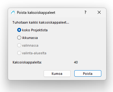 Tätä toimintoa on käytetty jo vuosia, ja aina poistettavaa on löytynyt. Tarkista kaksoiskappaleet -työkalu poistaa vain 100 % samanlaiset ja täsmälleen samassa paikassa sijaitsevat kohteet. Tämä tarkoittaa, että esimerkiksi ikkunalla on oltava samat leveys-, korkeus-, kynnys-, kehys- jne. asetukset. Usein löydetyt kaksoiskappaleet ovat viivoja jne., jotka ovat peräisin DWG-tiedostoista tai 2D-piirustuksiin muunnetuista osioista/julkisivuista.Toiminto ei välttämättä pienennä tiedostokokoa merkittävästi, mutta varmistaa, ettei tiedostossa ole kaksoiskappaleita. Hyödynnä sitä siis myös ennen taulukoiden julkaisua, jotta ikkunoiden/ovien ja muiden elementtien määrä on varmasti oikea.
