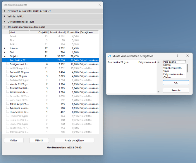Jos jollakin elementeistä on muuta kuin Ei asetettu Detaljitaso-sarakkeessa (katso kuva alla), valitse elementin rivi, paina Aseta detajitaso ja valitse Yksinkertainen tai muu sopiva arvo, kokeillaksesi miten monikulmiomäärä muuttuu (paina tarvittaessa Päivitä, jotta saat ajantasaisen laskelman).