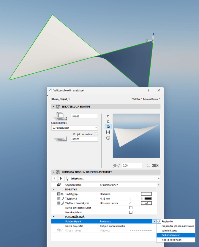 Rhino-geometriassa on tähän objektin asetuksissa valinta - avaa kohta Rhinosta tuodun objektin asetukset > 2D-esitys > Pohjanäkymä > Pohjanäkymä > ja valitse luettelosta "Vain ääriviivat".