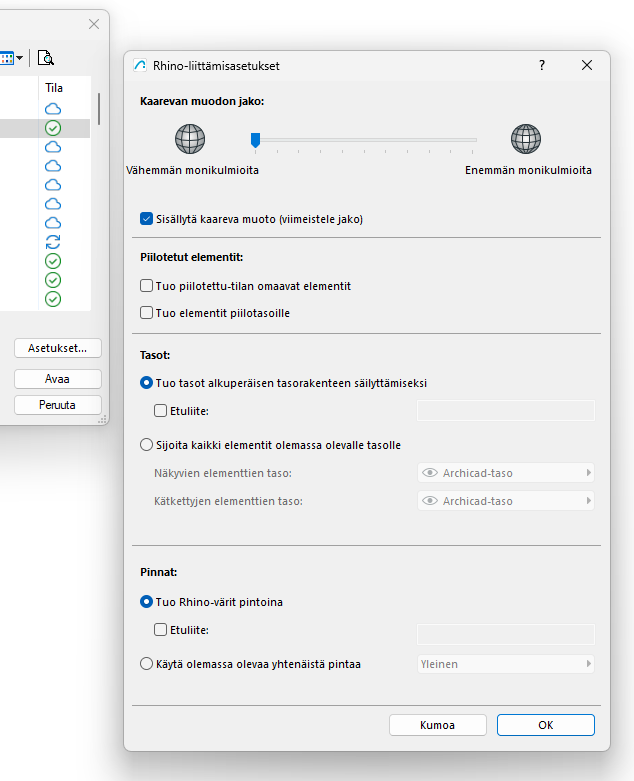 Rhino-tiedostot tuodaan usein oletusarvoisesti Enemmän monikulmioita -asetuksella. Tämä voi tehdä tiedostosta tarpeettoman suuren ja hitaan. Etenkään pienten osien esittäminen ei useimmiten vaadi suurta määrää monikulmioita. Rhino-geometrian monikulmioiden määrää voidaan vähentää tuonnin aikana valitsemalla tiedostoikkunassa Asetukset. Vedä tässä Rhino-liittämisasetukset-ikkunassa kohdistin kohtaan Vähemmän monikulmioita ja valitse ruutu Sisällytä kaareva muoto (viimeistele jako).