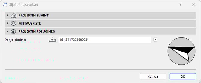 Yleisesti on tärkeää, että et aseta pohjoisen suuntaa kirjoittamalla kiertokulmaa. Syy tähän käy selville, jos nyt kun olet asettanut pohjoissuunnan, käyt tarkistamassa sen Vaihtoehdot - Projektin asetukset - Sijainnin asetukset -ikkunassa.