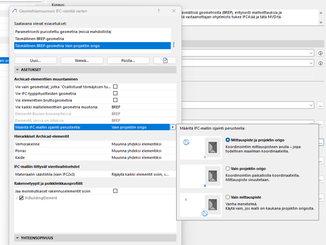 (samannäköisen lopputuloksen tekee myös Vain mittauspiste, mutta sitä ei yleisesti kannata käyttää, valinnalla on vaikutus IFC:n sisäiseen rakenteeseen) - Vain projektin origo -asetuksella IFC:n origoksi tulee Archicadin sisäinen origo, ja pohjoissuuntaa ei huomioida - tätä vaihtoehtoa ei yleensä ole perusteltua käyttää.