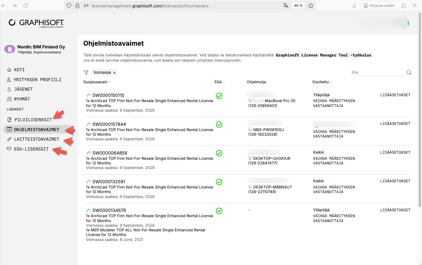 Yrityksen ylläpitäjä näkee tililleen kirjautuneena ollessaan yrityksen tilaukset ja sen hallussa olevat "pysyvät" lisenssit, mille laitteille ne on ladattu ja milloin.