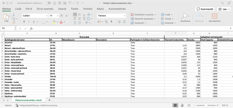 Uusia rakennusaineita lisättäessä riittää tietojen täydentämiseen, että ennen vientiä Archicadissa luodaan projektiin uudet rakennusaineet minimitiedoilla (nimi, pintamateriaali, prioriteetti ja oikea materiaaliluokitus), ja sen jälkeen niiden ominaisuustietoja voi täydentää tämän toiminnon avulla.