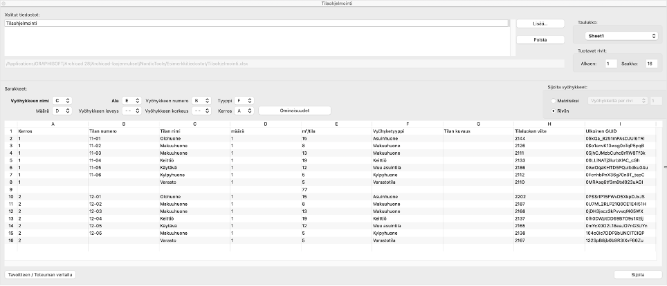 Toiminnon esimerkkitiedosto Tilaohjelmointi.xlsx löytyy Nordictools esimerkkitiedostot -kansiosta (Archicad -kansion alta Archicad-laajennukset -kansiosta). Muokkaamalla sen pohjalta, tai saman periaatteen mukaisia kokonaan uusia tiedostoja, voit tuoda tilaohjelman näppärästi Archicadiin. Tilaohjelmointi lukee valitun Excel-tiedoston ja ikkunassa sen valitun taulukon mukaiset tiedot (kuvassa valittuna Sheet1).