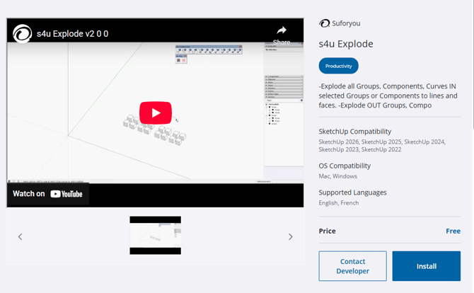 - Asenna s4u Explode -laajennus Extension Warehousesta (suora linkki - mutta helpoimmin asennus onnistuu hakemalla laajennusta Sketchupin sisällä).