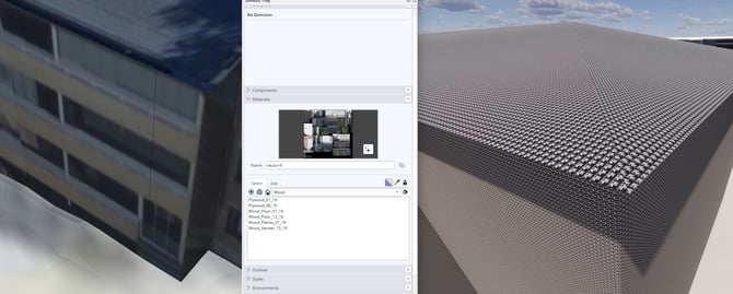 Vasemmalla Sketchup-malli ja sen materiaalin tekstuuri, oikealla rakennus Enscapessa.