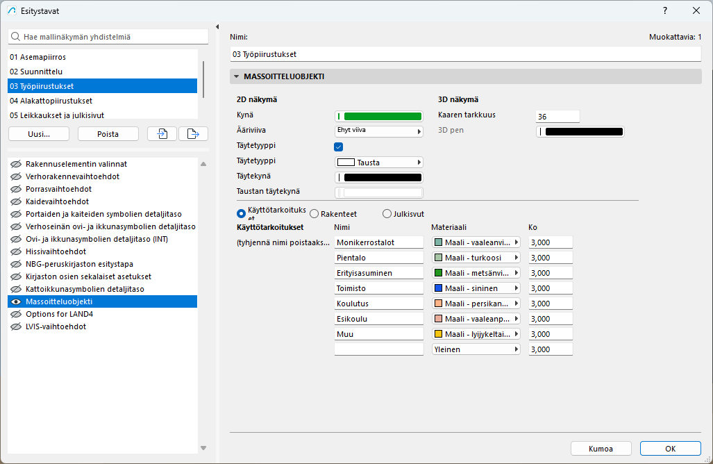 Objektissa on kaikki tarvittavat toiminnot, mutta versiossa 1 ei kaikkia tietoja voi hyödyntää suoraan Archicadissa. Taulukoiden avulla saa laskettua suoraan rakennusmassan bruttopinta-alan ja rakennusalan.