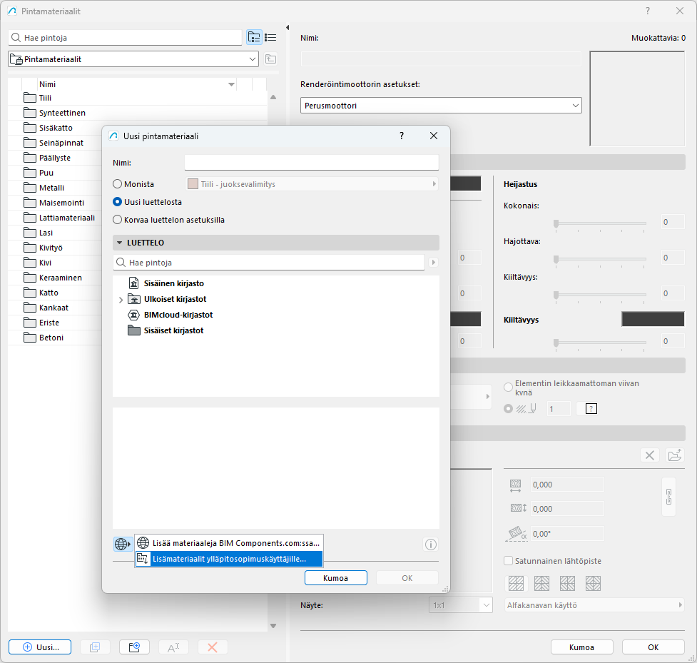 Avaa Pintamateriaalit-apuikkuna, paina Uusi..., valitse 'Uusi luettelosta' ja ikkunan vasemman alanurkan MAAPALLO-painikkeesta 'Lisämateriaalit ylläpitosopimuskäyttäjille'.