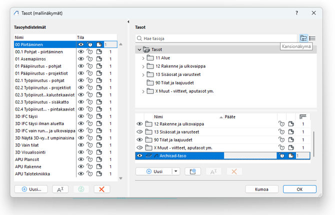 Archicad-ikkunan alareunan piirtonäkymäpalkista näet ikkunassa sillä hetkellä käytössä olevan tasoyhdistelmän. Klikkaamalla tasoasetukset-painiketta, tai Ctrl-L, avautuu Tasot-apuikkuna.