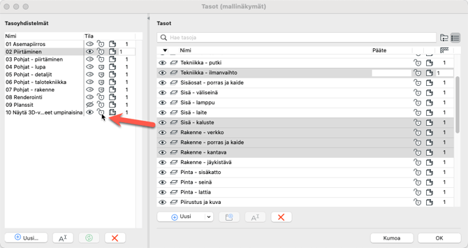 Apuikkuna on jaettu kahteen pystysarakkeeseen - vasemmalla ovat tasoyhdistelmät, ja oikealla tasot, jotka voidaan näyttää kansio- tai listanäkymänä. Kun oikealta on valittu yksi tai useampia tasoja, vasemmalla voit kunkin tasoyhdistelmän kohdalla hallita niille tallennettua tilaa, eli näkyvyyttä, lukitusta, rautalankaesitystä sekä risteämisryhmää.