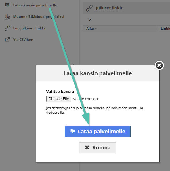 - Etsi sitten BIMcloud Managerissa projekti ja lataa koko kansio sen alle. On tärkeää, että kansiossa on tässä vaiheessa jo sisältöä, muuten se ei tule näkyviin näy BIMcloudissa: