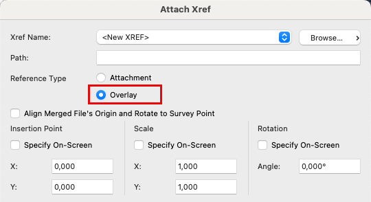 The Overlay option ensures that Archicad does not search for other files that an AutoCAD user may have linked into their DWG file. Make sure that the file locations are on a shared server accessible to all users in the project. If Archicad cannot find the file, it will spend time searching for it.