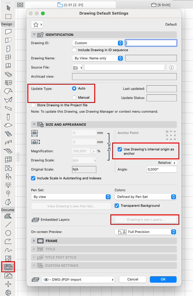 By enabling Use Drawing’s Internal Origin as Anchor, you ensure that the file’s origin point is used as the anchor. Click at the origin when placing the file to position it correctly with this option enabled.