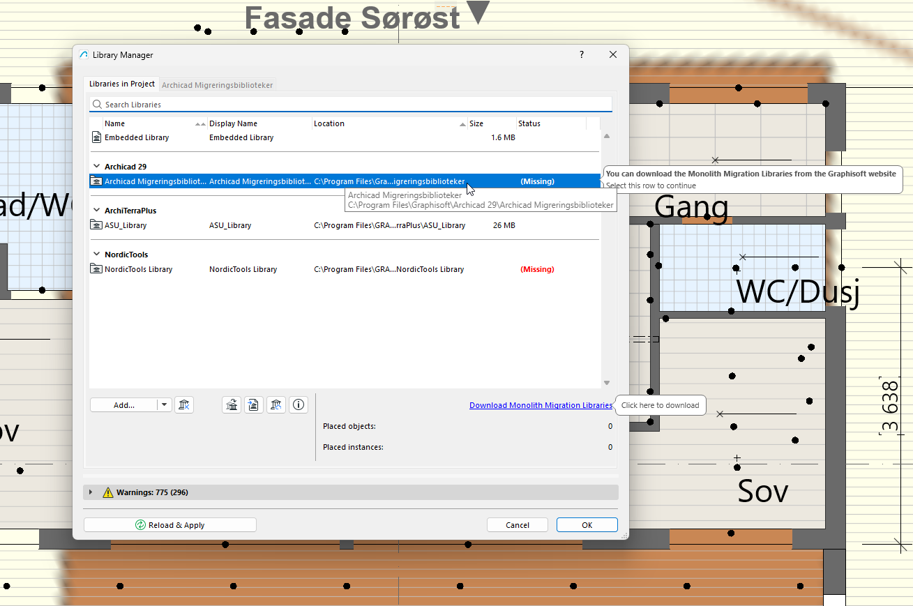 Da vil du se under Archicad 29 at de mangler et migreringsbibliotek. Du vil også få en nedlastningslenke du kan trykke på.