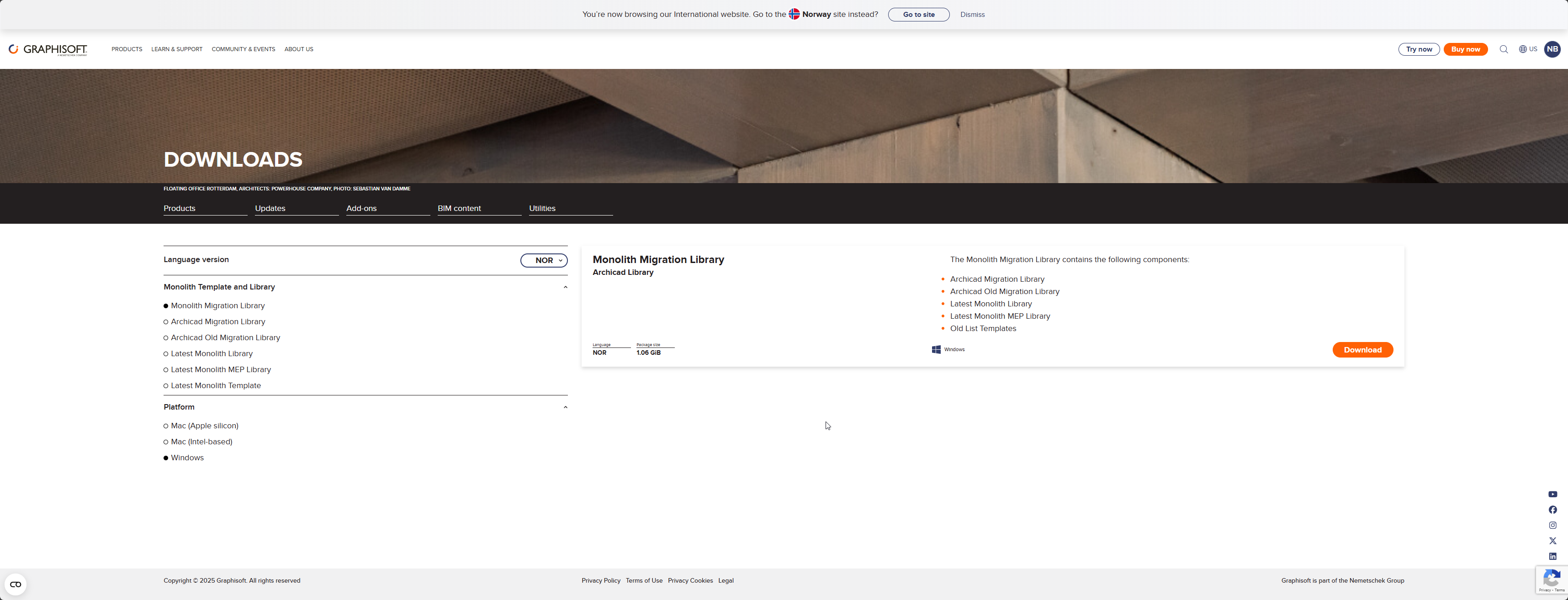Klikker du på den blir du sendt til Graphisoft sine sider, hvor du kan laste ned Monolith Migration Libraries: