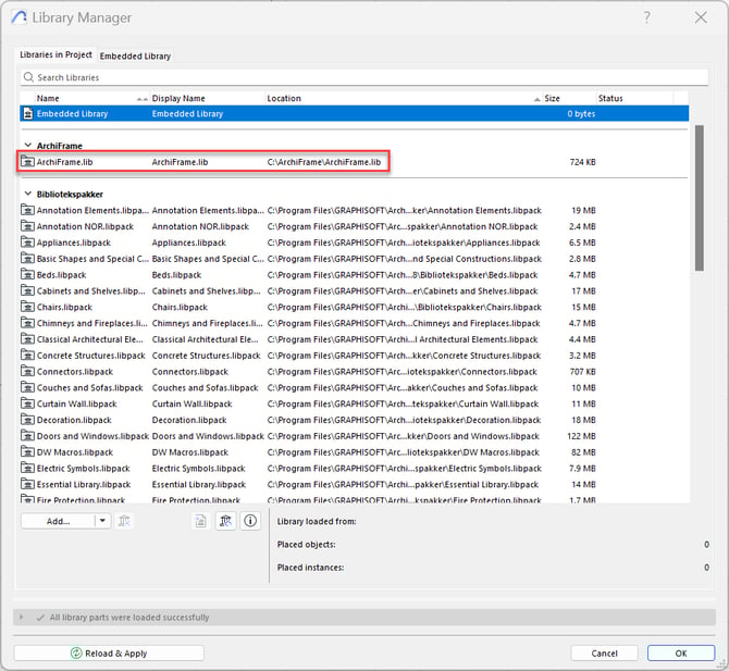 Løsningen er å åpne Library Manager > Trykke på Add... legg til biblioteket som heter ArchiFrame.lib. Dette biblioteket ligger i ArchiFrame-mappen, sammen med Data_NOR mappen.