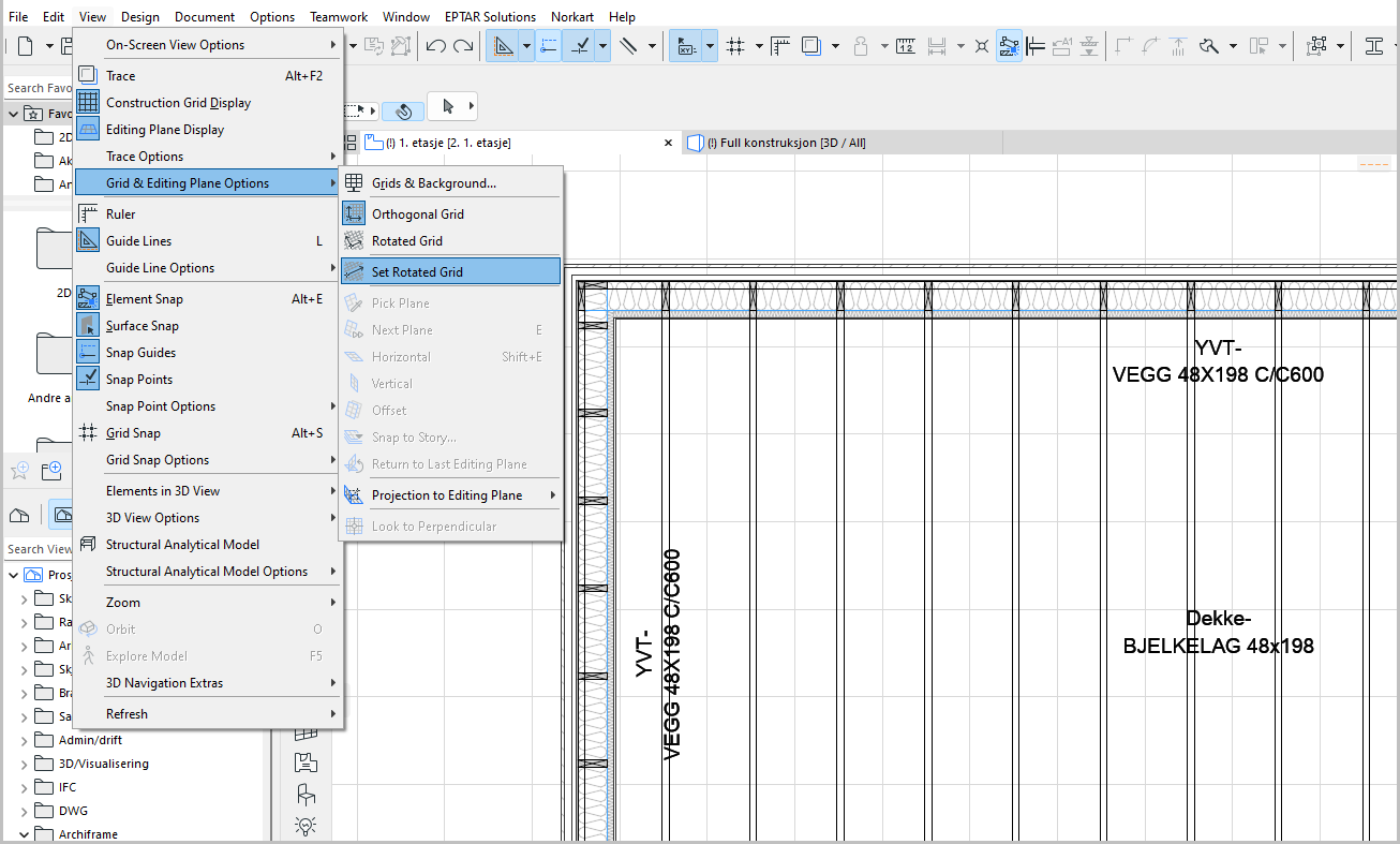 Men dersom man har en rotasjon av arbeidsmiljøet i Archicad vil ikke denne funksjonen virke uten videre.