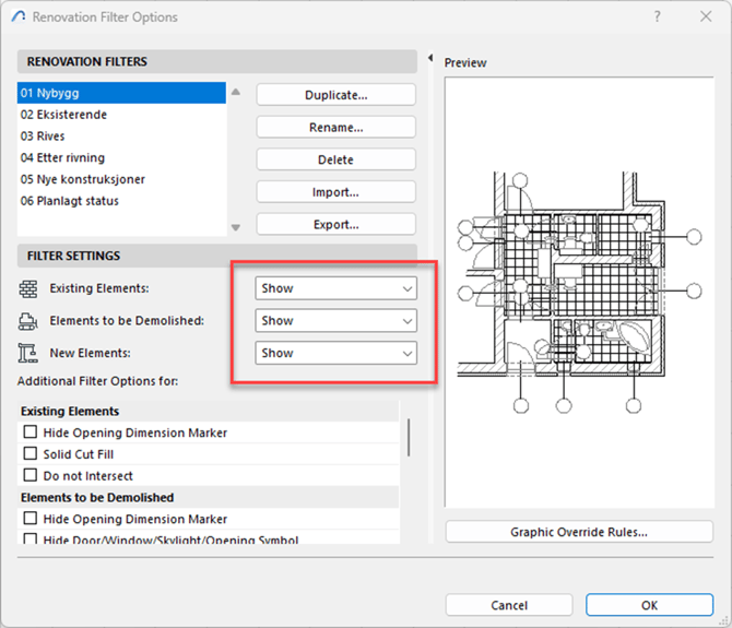 - Åpne Renovation filter Options (Doocument > Renovation), og sørg for at filter settings står på show