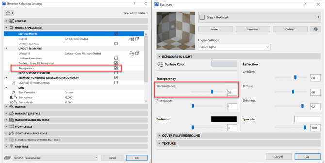 For å få denne effekten må transparency være aktivert under model appearance i Elevation Settings og materialets overflate (surface) må ha en transmittance over 51.