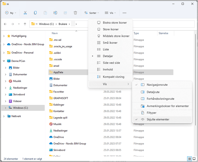 Windows 11: Klikk på de 3 linjene i overskriften til filutforskeren og velg Vis > Skjulte elementer.