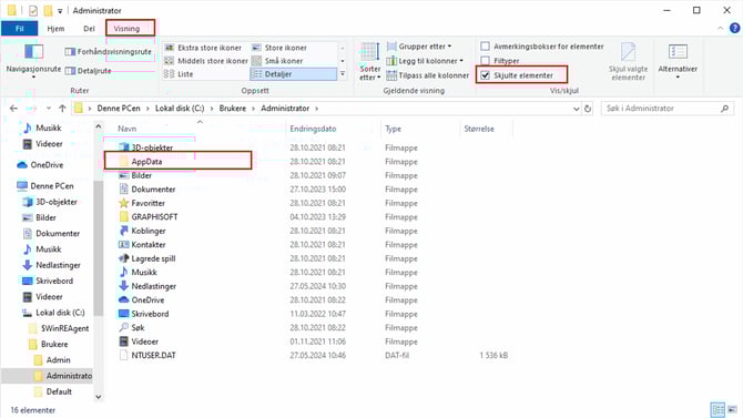 Windows 10: klikk på Vis-fanen og merk av i boksen for "Skjulte elementer"