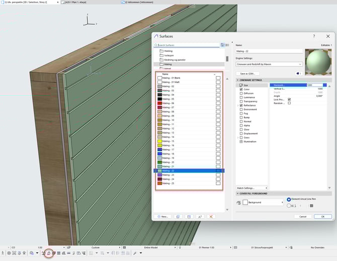 Finn først fargekoden du ønsker å bruke i Archicad under Surfaces.