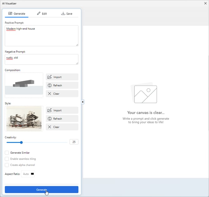 Under composition så kan man enten importere et bilde, eller trykke på Refresh for å hente aktuelt utsnitt fra Archicad. Clear sletter det man eventuelt har valgt der.