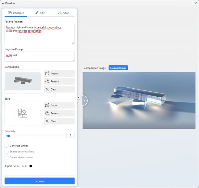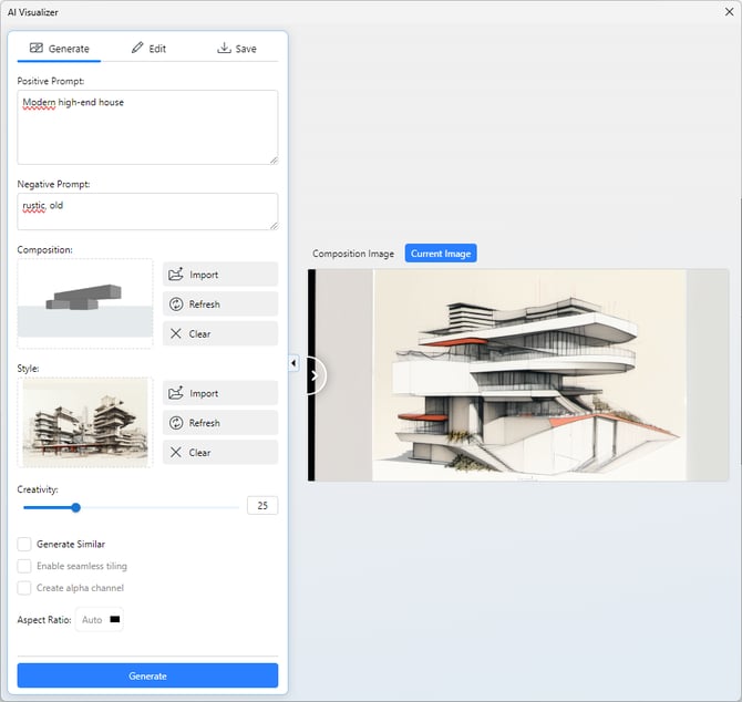 Dersom jeg flytter litt på kameraet og trykker refresh under composition, skriver litt til i prompts og fjerner style bildet, så får jeg dette når jeg trykker på Generate igjen: