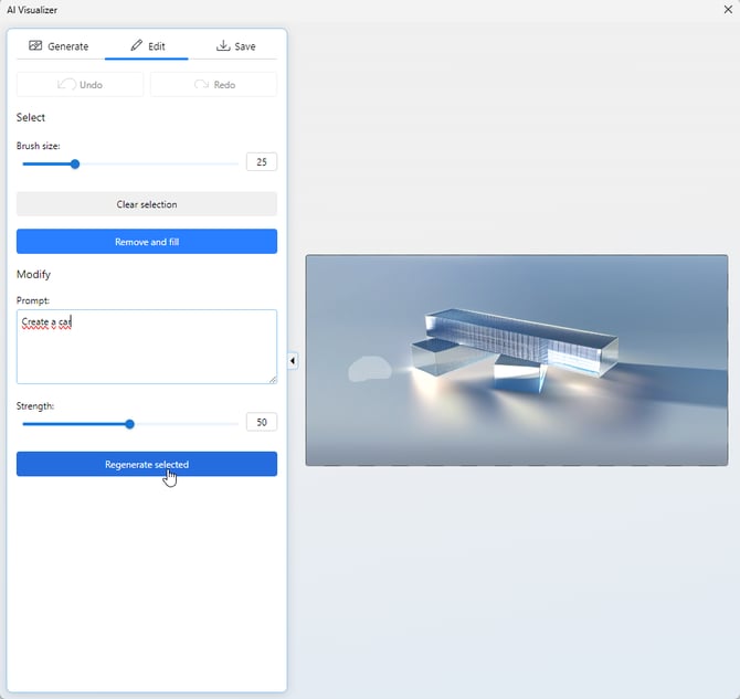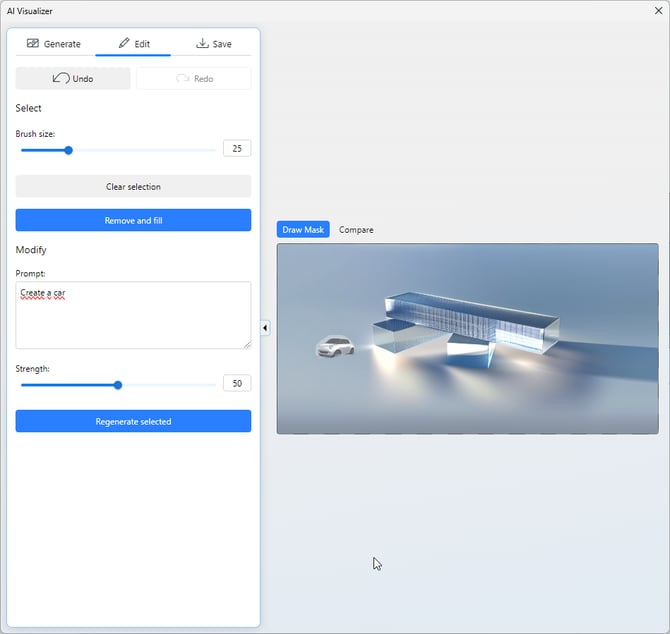 Som du ser over har jeg markert et lite område til venstre for bygget. Under prompt har jeg skrevet create a car. Når jeg trykker på regenerate selected legger den til en bil: