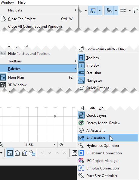 For å komme i gang med AI Visualiser må du åpne opp AI Visualiser Paletten. Den får du skrudd på ved å gå på Window, Palettes og Ai Visualizer.