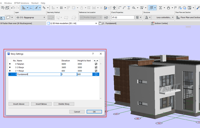 Bygget kan flyttes senere ved å dra i det i planen, og ønsker du å endre cote-høyden, så endrer du "Height to next" i hav-etasje settingen.