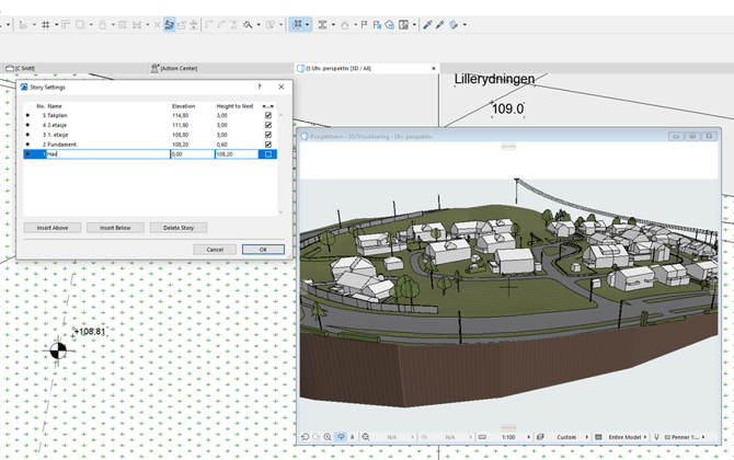 I denne filen har jeg satt enheter til meter, med 2 desimaler. Dette gjør man under Options > Project Preferences > Working Units. Det er en av metodene som er enklest når man driver med kartdata. Jeg har også satt opp etasjestrukturen, med en hav-etasje med høyden opp til der jeg vil ha fundamentet, og resten oppover med "Height to next", likt med det jeg har i bygg fila.