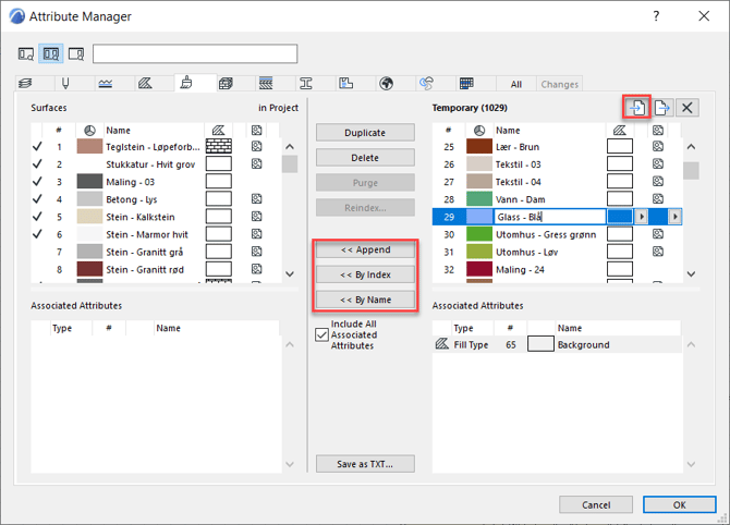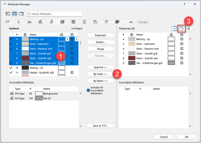 I mange tilfeller lønner det seg å eksportere/importere "By Index" (#). Dette er nummeret Archicad leser for å identifisere de forskjellige attributtene. Det kan derfor lønne seg å sammenligne filene, slik at man ikke overskriver f.eks en Composite, Surface, eller endrer på favoritter. Lenke med mer informasjon i bunn av denne artikkelen.