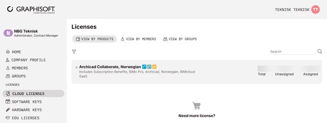 - Velg Cloud Licenses for å se alle lisenser tilknyttet bedriften.