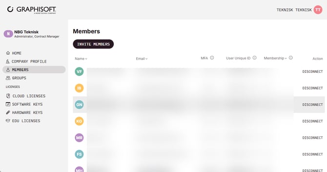 - Under View by members, finner du alle brukere som er tilknyttet bedriften.