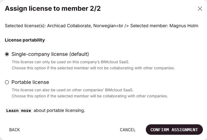 - Du kan tilordne personlige lisenser ved å klikke på Assign New under brukeren → Velg lisens → Klikk Next → Klikk Confirm Assignment