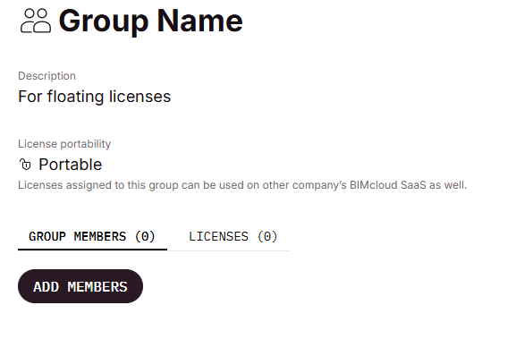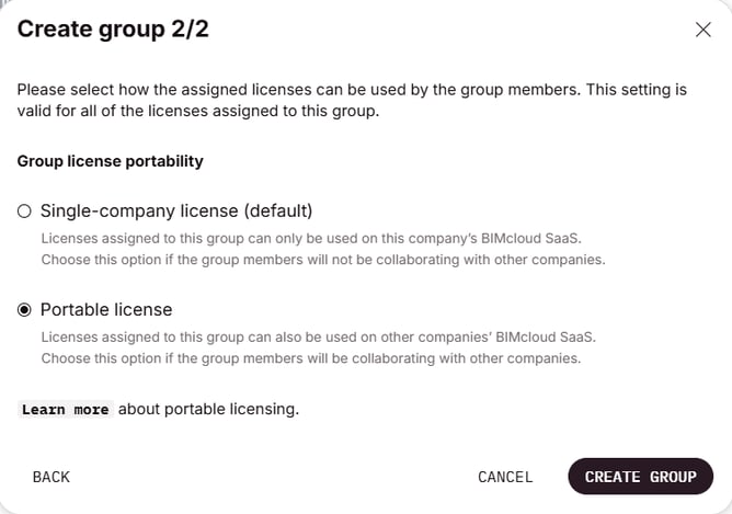 - Velg om gruppen skal ha Single Company-lisenser eller Portable lisenser (for bruk mot andres BIMcloud). Portable lisenser må aktiveres under Company Profile.