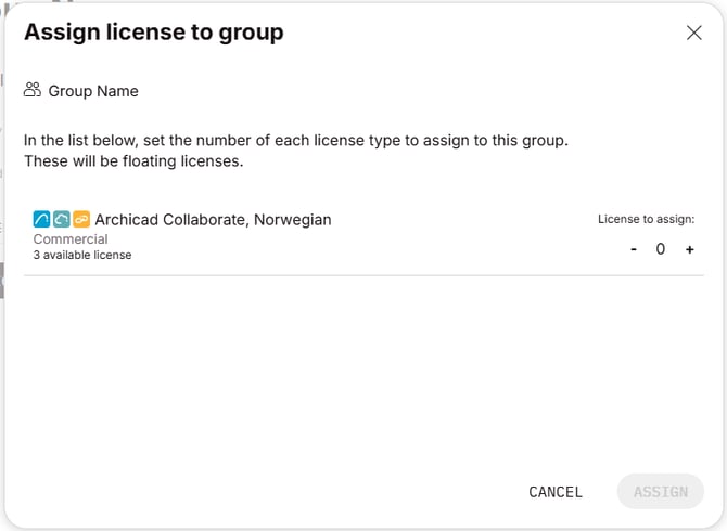 Alle lisenser som tildeles gruppen er flytende mellom alle brukerne i gruppen. 15 lisenser betyr at opptil 15 brukere kan bruke Archicad samtidig.